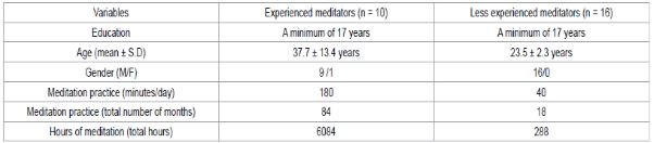 The participants were twenty-six right handed trained meditators. Ten of them (9 males; group average age ± SD; 37.7 ± 13.4 years) had 7 years of experience of meditation {(7 years × 12 months × 24 days × 180 minutes)/60} = 6048 hours), practiced as the two stages, meditative focusing (ME) leading to pure meditation (ME). The other sixteen meditators had 18 months experience of the same meditation. They were all males and had an average age of 23.5 ± 2.3 years with experience of 288 hours {(18 month × 24 days × 40 minutes)/60} = 288 hours). The two groups significantly differed with respect to age (t = 4.11 ; df = 24 ; p = 0.0003). Baseline characteristics of the experienced and less experienced meditators are given in Table 1. Participants were recruited for the trial by notices on the notice boards of the institution, the Indian Council of Medical Research Center for Advanced Research (ICMR-CAR), located in Bangalore, south India. This center is attached to a residential yoga training center where meditators receive training in meditation and come for advanced retreats. There was no incentive to take part in the study and while the study design was explained to the participants, the research question was not. To be included in the trial participants had to meet the following criteria (i) normal health based on a routine physical and mental health examination, (ii) right hand dominance based on a routine hand dominance inventory,14 and (iii) regularity in their practice of meditation, where regularity meant practicing for at least 40 minutes a day for six days in a week. The experienced meditators practiced for 180 minutes in a day while the inexperienced meditators practiced for 40 minutes each day. Pre-determined exclusion criteria were: (i) if they were not able to be scanned due to claustrophobia, metal implants, a pacemaker, or pregnancy, and (ii) inability to meditate in the scanner environment. None of the participants had to be excluded for these reasons. The study was approved by the Institutions’ ethics committees of the (i) Indian Council of Medical Research Center for Advanced Research (ICMR-CAR), and (ii) the National Institute of Mental Health and Neurosciences (NIMHANS), both located in Bangalore in south India. Signed informed consent was obtained from all the participants following the guidelines of the Indian Council of Medical Research.
