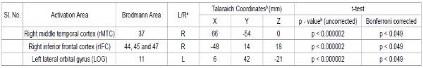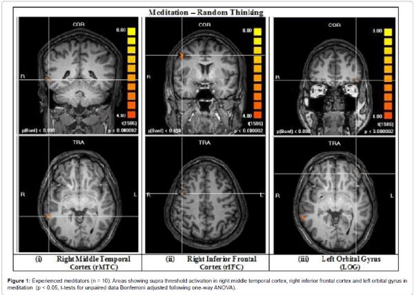 Meditators with a total of 6048 (7 years) of experience of meditation on the Sanskrit syllable “Om’ showed significant activation in the right medial temporal cortex (rMTG), right inferior frontal cortex (rIFG), and left orbital gyrus (LOG) during the stage of effortless or “pure” meditation. The comparison was with a period of random thinking. There were no changes during meditation with focusing or during focusing alone compared to random thinking.