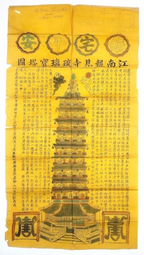 This picture shows the porcelain pagoda (or stupa) of the Pao-en-szu of Nanking. In Chinese, the pagoda was called Bao’ensi, the ‘Temple of Gratitude’. The Europeans called it the ‘Porcelain Tower’ and considered it one of the wonders of the world. A stupa is a mound-like or hemispherical structure containing relics that is used as a place of meditation.