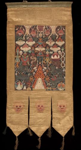 On this banner is the four-faced turban-clad Brahma. He is a protector associated with the meditative experiences of the ‘world-system of form’ (gzugs-kyi khams), and is acknowledged as the head of a group known as the ‘liberating’ protectors (sgrol-‘ging). Though he is a Hindu god, he and Indra have been incorporated in the Buddhist pantheon.