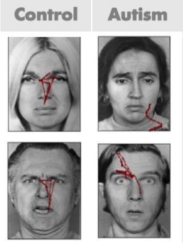 Consider the results of an eye tracking study in which Pelphrey and colleagues (2002) observed that individuals with autism did not make use of the eyes when judging facial expressions of emotion (see right panels of Figure 1). While repetitive behaviors or language deficits are seen in other disorders (e.g., obsessive-compulsive disorder and specific language impairment, respectively), basic social deficits of this nature are unique to ASD. Onset of the social deficits appears to precede difficulties in other domains (Osterling, Dawson, & Munson, 2002) and may emerge as early as 6 months of age (Maestro et al., 2002).