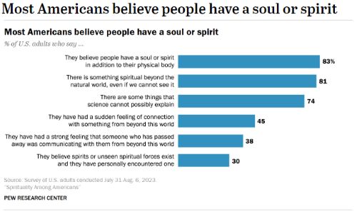 - 83% of all U.S. adults believe people have a soul or spirit in addition to their physical body.