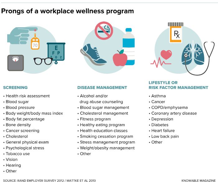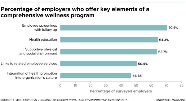 It doesn’t just offer health screenings and behavior-change programs, the scientists wrote. It exists within a healthy work environment. The cafeteria sells nutritious food, bosses support taking breaks, there are on-site exercise spaces or walking trails. It dovetails with a company’s other benefits and safety policies; after all, if you’re breathing chemical fumes on the factory floor, you might scoff if an employer urges you to quit smoking.