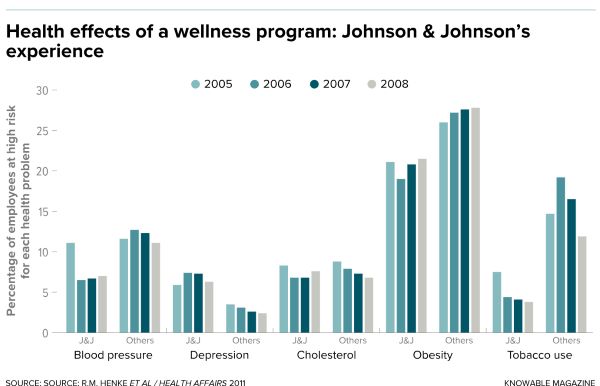 Certainly, Johnson & Johnson’s wellness program has been analyzed backward, forward and sideways because of the company’s size and the program’s longevity. One report commissioned by the company, focusing on 2002-2008 data, found savings of about $565 annually per employee in health care costs and determined that workers had lower rates of obesity, hypertension and tobacco use than average. Other major corporations, such as Lockheed Martin and Ford, show benefits, too.