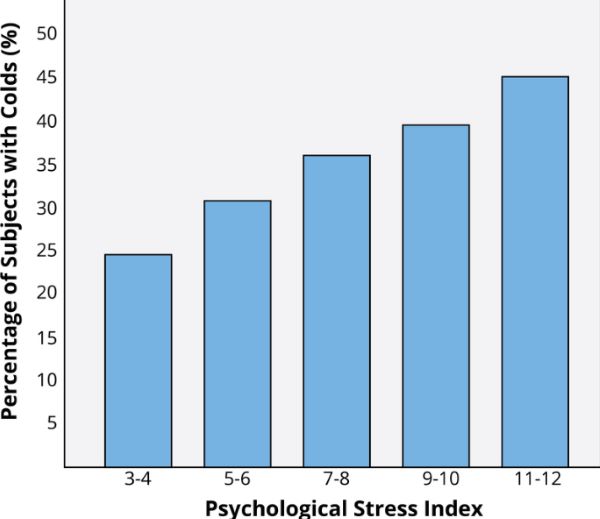 ou probably know exactly what it’s like to feel stress, but what you may not know is that it can objectively influence your health. Answers to questions like, “How stressed do you feel?” or “How overwhelmed do you feel?” can predict your likelihood of developing both minor illnesses as well as serious problems like future heart attack (Cohen, Janicki-Deverts, & Miller, 2007). (Want to measure your own stress level? Check out the links at the end of the module.) To understand how health psychologists study these types of associations, we will describe one famous example of a stress and health study. Imagine that you are a research subject for a moment. After you check into a hotel room as part of the study, the researchers ask you to report your general levels of stress. Not too surprising; however, what happens next is that you receive droplets of cold virus into your nose! The researchers intentionally try to make you sick by exposing you to an infectious illness. After they expose you to the virus, the researchers will then evaluate you for several days by asking you questions about your symptoms, monitoring how much mucus you are producing by weighing your used tissues, and taking body fluid samples—all to see if you are objectively ill with a cold. Now, the interesting thing is that not everyone who has drops of cold virus put in their nose develops the illness. Studies like this one find that people who are less stressed and those who are more positive at the beginning of the study are at a decreased risk of developing a cold (Cohen, Tyrrell, & Smith, 1991; Cohen, Alper, Doyle, Treanor, & Turner, 2006) (see Figure 1 for an example).