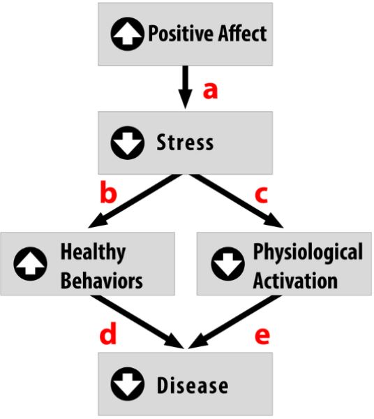 Positive traits and states, on the other hand, are often health protective. For example, characteristics like positive emotions (e.g., feeling happy or excited) have been tied to a wide range of benefits such as increased longevity, a reduced likelihood of developing some illnesses, and better outcomes once you are diagnosed with certain diseases (e.g., heart disease, HIV) (Pressman & Cohen, 2005). Across the world, even in the most poor and underdeveloped nations, positive emotions are consistently tied to better health (Pressman, Gallagher, & Lopez, 2013). Positive emotions can also serve as the “antidote” to stress, protecting us against some of its damaging effects (Fredrickson, 2001; Pressman & Cohen, 2005; see Figure 2). Similarly, looking on the bright side can also improve health. Optimism has been shown to improve coping, reduce stress, and predict better disease outcomes like recovering from a heart attack more rapidly (Kubzansky, Sparrow, Vokonas, & Kawachi, 2001; Nes & Segerstrom, 2006; Scheier & Carver, 1985; Segerstrom, Taylor, Kemeny, & Fahey, 1998).