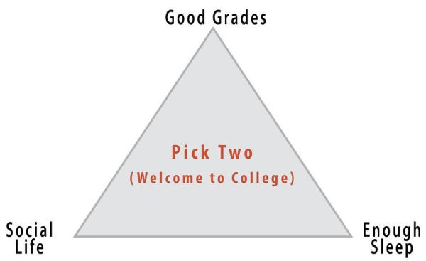 As a student, you probably strive to maintain good grades, to have an active social life, and to stay healthy (e.g., by getting enough sleep), but there is a popular joke about what it’s like to be in college: you can only pick two of these things (see Figure 3 for an example). The busy life of a college student doesn’t always allow you to maintain all three areas of your life, especially during test-taking periods. In one study, researchers found that students taking exams were more stressed and, thus, smoked more, drank more caffeine, had less physical activity, and had worse sleep habits (Oaten & Chang, 2005), all of which could have detrimental effects on their health. Positive health practices are especially important in times of stress when your immune system is compromised due to high stress and the elevated frequency of exposure to the illnesses of your fellow students in lecture halls, cafeterias, and dorms.