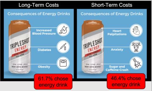 Students then had a choice between receiving an energy drink or another attractive prize. Those who read about the short-term costs were 25% less likely to choose the energy drink than those who read about the long-term costs.