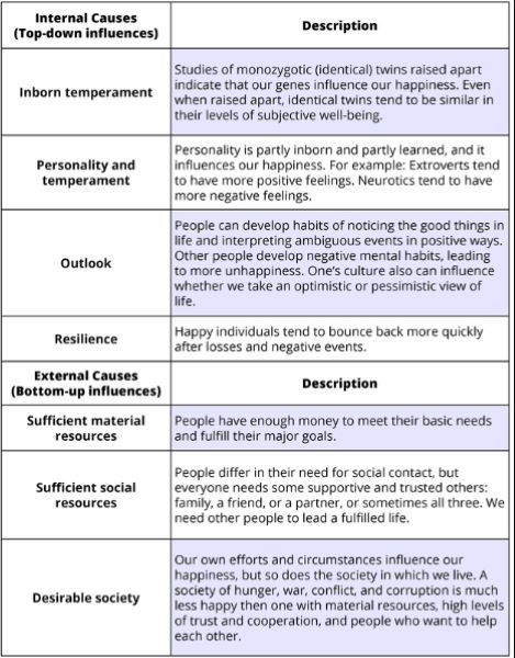 In the table above are shown internal and external circumstances that influence happiness. There are individual differences in what makes people happy, but the causes in the table are important for most people (Diener, Suh, Lucas, & Smith, 1999; Lyubomirsky, 2013; Myers, 1992).