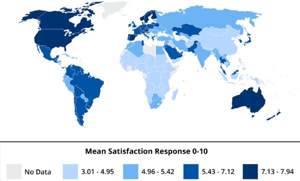When people consider their own happiness, they tend to think of their relationships, successes and failures, and other personal factors. But a very important influence on how happy people are is the society in which they live. It is easy to forget how important societies and neighborhoods are to people’s happiness or unhappiness. In Figure 1, I present life satisfaction around the world. You can see that some nations, those with the darkest shading on the map, are high in life satisfaction. Others, the lightest shaded areas, are very low. The grey areas in the map are places we could not collect happiness data—they were just too dangerous or inaccessible.