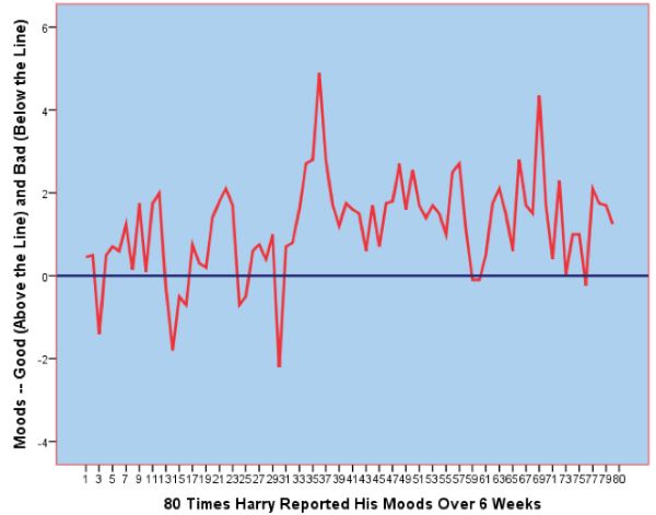 An example of adaptation to circumstances is shown in Figure 3, which shows the daily moods of “Harry,” a college student who had Hodgkin’s lymphoma (a form of cancer). As can be seen, over the 6-week period when I studied Harry’s moods, they went up and down. A few times his moods dropped into the negative zone below the horizontal blue line. Most of the time Harry’s moods were in the positive zone above the line. But about halfway through the study Harry was told that his cancer was in remission—effectively cured—and his moods on that day spiked way up. But notice that he quickly adapted—the effects of the good news wore off, and Harry adapted back toward where he was before. So even the very best news one can imagine—recovering from cancer—was not enough to give Harry a permanent “high.” Notice too, however, that Harry’s moods averaged a bit higher after cancer remission. Thus, the typical pattern is a strong response to the event, and then a dampening of this joy over time. However, even in the long run, the person might be a bit happier or unhappier than before.