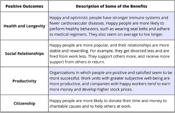 Is the state of happiness truly a good thing? Is happiness simply a feel-good state that leaves us unmotivated and ignorant of the world’s problems? Should people strive to be happy, or are they better off to be grumpy but “realistic”? Some have argued that happiness is actually a bad thing, leaving us superficial and uncaring. Most of the evidence so far suggests that happy people are healthier, more sociable, more productive, and better citizens (Diener & Tay, 2012; Lyubomirsky, King, & Diener, 2005). Research shows that the happiest individuals are usually very sociable. The table below summarizes some of the major findings.