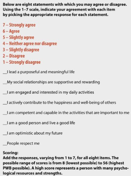 - Subjective well-being scales: Self-report surveys or questionnaires in which participants indicate their levels of subjective well-being, by responding to items with a number that indicates how well off they feel.