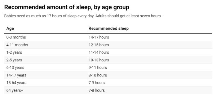 That’s why babies need 14 to 17 hours of sleep per day for the first three months of their lives – newborns are asleep way more than they are awake. Most school-aged kids need about 8 to 10 hours of sleep. Teens can aim for nine hours, which is what some adults need too. But seven or eight hours is enough for other grownups.