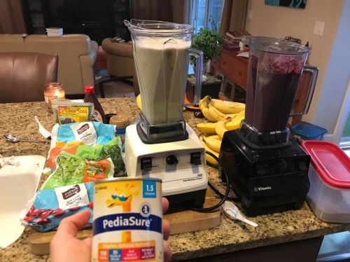 As a pathological overachiever, I didn’t want to just tube feed my child. I wanted to be the best at tube feeding. As we struggled to find a formula that worked, my son’s doctor suggested a blended-food diet but didn’t provide much guidance on how to do it. I started with baby food, then slowly started blending normal food and putting it through the tube. Through trial and error, I figured out the best, most calorically dense and nutritionally complete blended diet. The whole family worked to blend a month’s worth of food, made from bananas, carrots, spinach, eggs, and flax seed.
