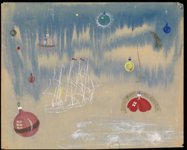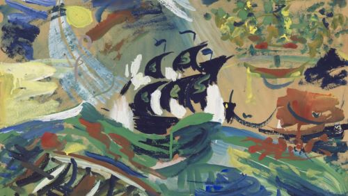 ‘Christmas Decorations’ by Ron Hampshire. Adamson explains that Ron was very fond of a shiny red bauble, which he carried around with him. While painting it, a ghost ship emerged in the painting.