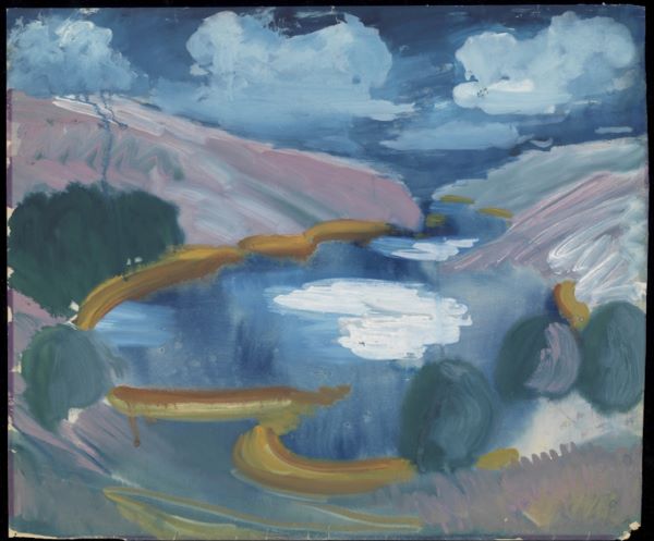 ‘The Lake’ by Ron Hampshire. This was Ron’s first attempt at a landscape. Adamson sees this as significant. “Here is a sensuous delight in the use of colour, quite in contrast to the rigidity of the first pencil drawings.”