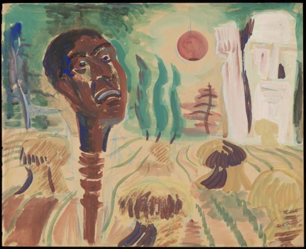 ‘The Severed Head’ by Ron Hampshire. Adamson sees signs of a struggle in this work where “the setting is now on dry land in what seems to be a cornfield”. Adamson notes that at the time the picture was painted, Ron “was beginning to use one or two words with great difficulty”.