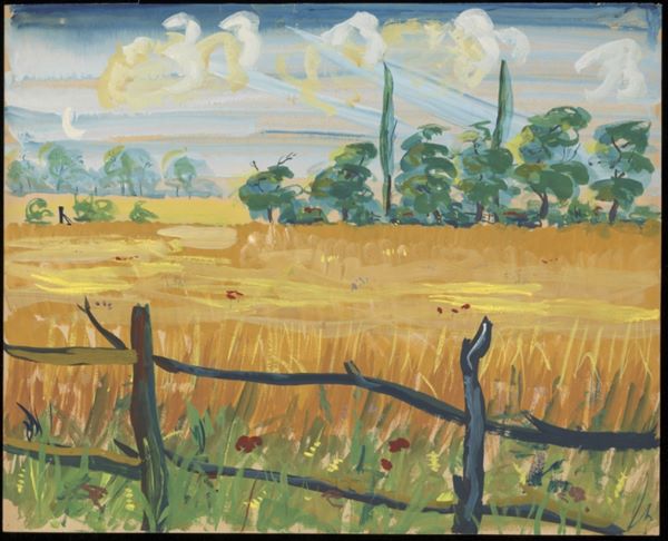 ‘The Cornfield’ by Ron Hampshire. The cornfield is now ripe and golden, ready to be harvested. But, Adamson observes, “There is still an ominous dark fence which surrounds the field.”