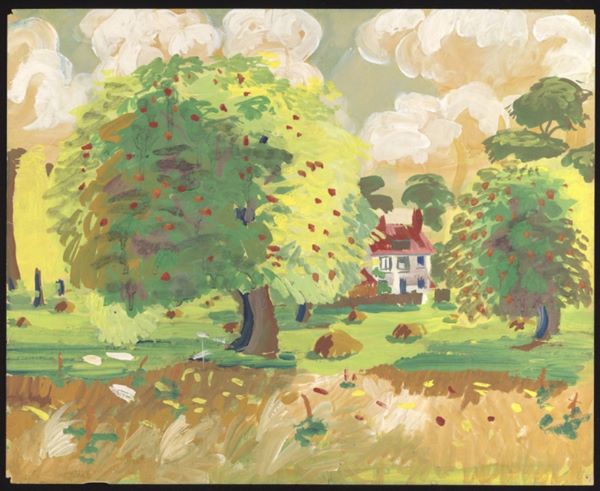 ‘The Trees’ by Ron Hampshire. When Ron painted this picture he could talk with increasing fluency. For Adamson, “the dark fence has retreated to enclose the house in the background” and the trees are in full bloom in a field of flowers.