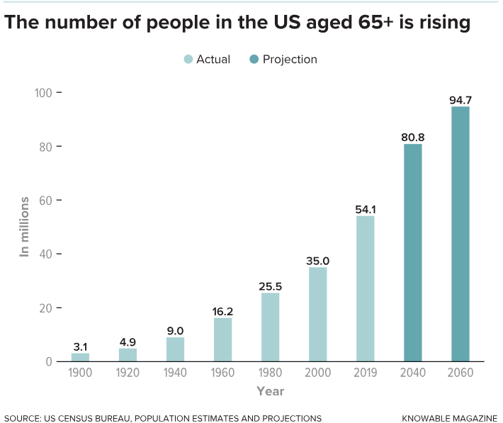 Worldwide, the number of adults age 65 and up is on the rise. In the United Kingdom, for example, the number of older individuals is projected to increase by 67 percent — or an additional 8.2 million people, a population roughly the size of modern-day London — from 2019 to 2068. In the United States, the portion of older adults is expected to rise by about 81 percent, or 42.3 million more people, from 2018 to 2060.