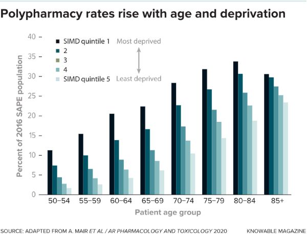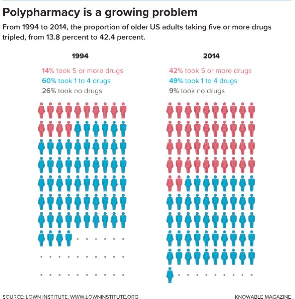 As people age, chronic medical conditions, from osteoporosis to cardiovascular disease to cancer, become more common. And for medical systems across many countries, prescribing drugs is the go-to method to treat these illnesses. According to a report by the Lown Institute, a nonprofit think tank, 42 percent of all older adults in the US take five or more prescription medications a day. Almost 20 percent take 10 drugs or more, and over the past 20 years, incidences of polypharmacy have tripled across the country.