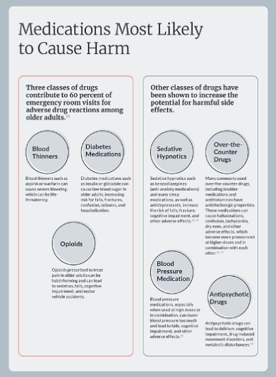 But when the risk of the medications outweighs their potential benefits, patients are in danger of significant health consequences. Every day, 750 older adults are hospitalized due to serious side effects from their medications, including falls, allergic reactions and internal bleeding. And with each additional medication prescribed, the risk of an adverse reaction increases by 7 to 10 percent.