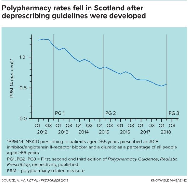 Scotland’s polypharmacy guidelines by drug and health care experts, first published in 2012, were designed to fill this resource gap and aid clinicians throughout the prescription and deprescription process. The effort’s “7-Steps” technique encourages doctors to carefully review a patient’s diagnoses and treatments, determine which drugs the individual needs, identify potential adverse drug reactions and ensure that the patient is involved in the decision-making process.