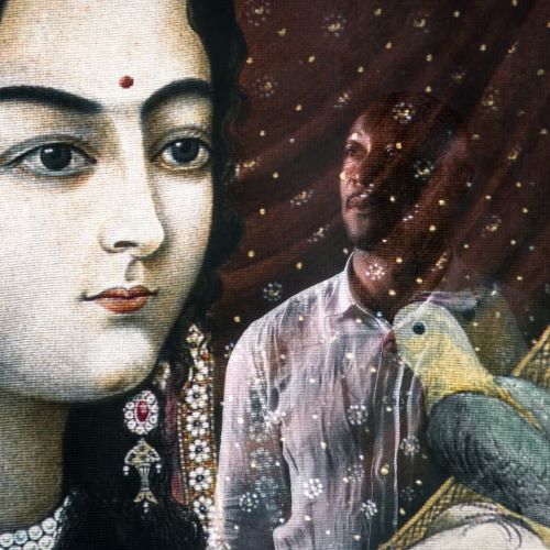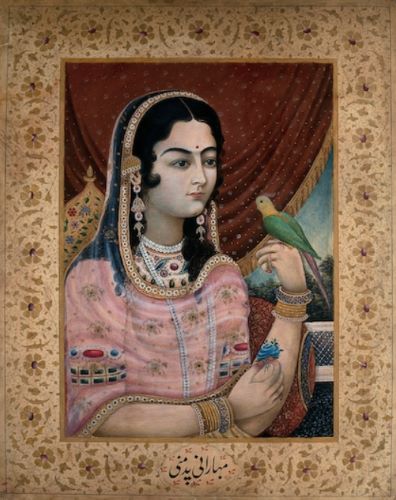 A Mughal courtesan or member of a Mughal royal family looking at a parrot perched on her hand. Gouache painting by an Indian painter. 19th century.