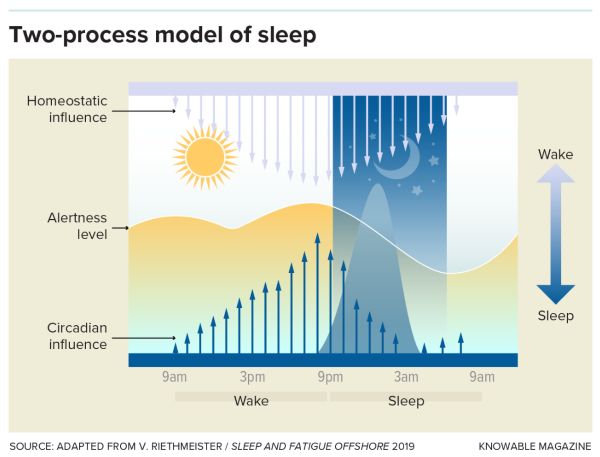 Most of what we know about sleep and sleep deprivation stems from a model proposed in the 1970s by a Hungarian-Swiss researcher named Alexander Borbély. His two-process model of sleep describes how separate systems — circadian rhythm and sleep homeostasis — interact to govern when and how long we sleep. The circadian clock dictates the 24-hour cycle of sleep and wakefulness, guided by external cues like light and darkness. Sleep homeostasis, on the other hand, is driven by internal pressure that builds while you’re awake and decreases while you’re asleep, ebbing and flowing like hunger.