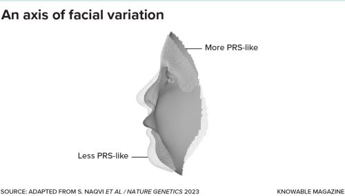 Other evidence hints that Naqvi might be on the right track in thinking that faces vary along predefined axes. For example, geneticist Hanne Hoskens, Claes’s former student and now a postdoc in Hallgrímsson’s lab, sorted people’s faces according to how closely they resembled the prominent forehead, flattened nose and other features characteristic of achondroplasia, the most common form of dwarfism. (Think of the actor Peter Dinklage, for example.) Those at the more dwarflike end of the range tended to have different variants of genes related to cartilage development than those with less dwarflike faces, she found.
