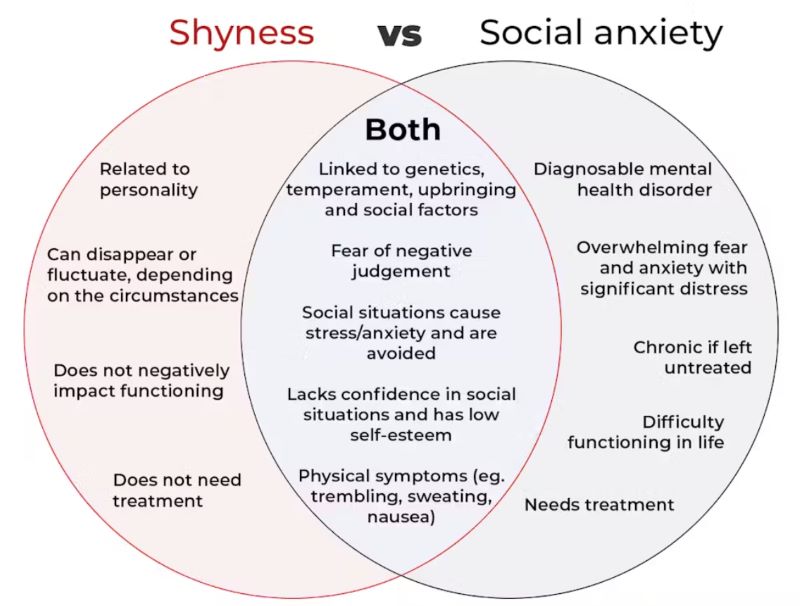 The impact this has on a person’s ability to lead a meaningful and fulfilling life, and the distress this causes, differentiates social anxiety from shyness.