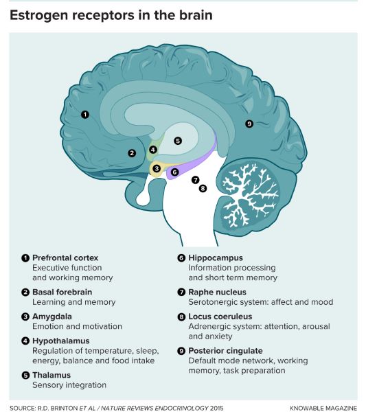 In the past decade, a clearer picture has emerged of estrogen’s role in the brain. Estrogen receptors are present in the hippocampus, amygdala and hypothalamus, regions that are important to cognition, emotional processing and stress responses. Before perimenopause hits, the hormone, in the form of circulating estradiol, helps keep these systems running smoothly, says Paul Newhouse, who investigates cognitive and neuropsychiatric disorders at Vanderbilt University in Nashville, Tennessee.
