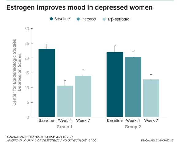 A landmark study published in JAMA Psychiatry in 2015 demonstrated that women with a history of depression are more sensitive to changing levels of estrogen and that those fluctuations can trigger severe depression. Healthy postmenopausal women, some with a history of depression and some without, were given estradiol through a skin patch. After three weeks, some women from each group got a placebo instead of the estradiol. Roughly 80 percent of the women who had suffered with severe depression in the past experienced a recurrence when estrogen was withdrawn and they were switched to the placebo, the National Institutes of Health study found. But those with no history of depression were fine when the estrogen was taken away.